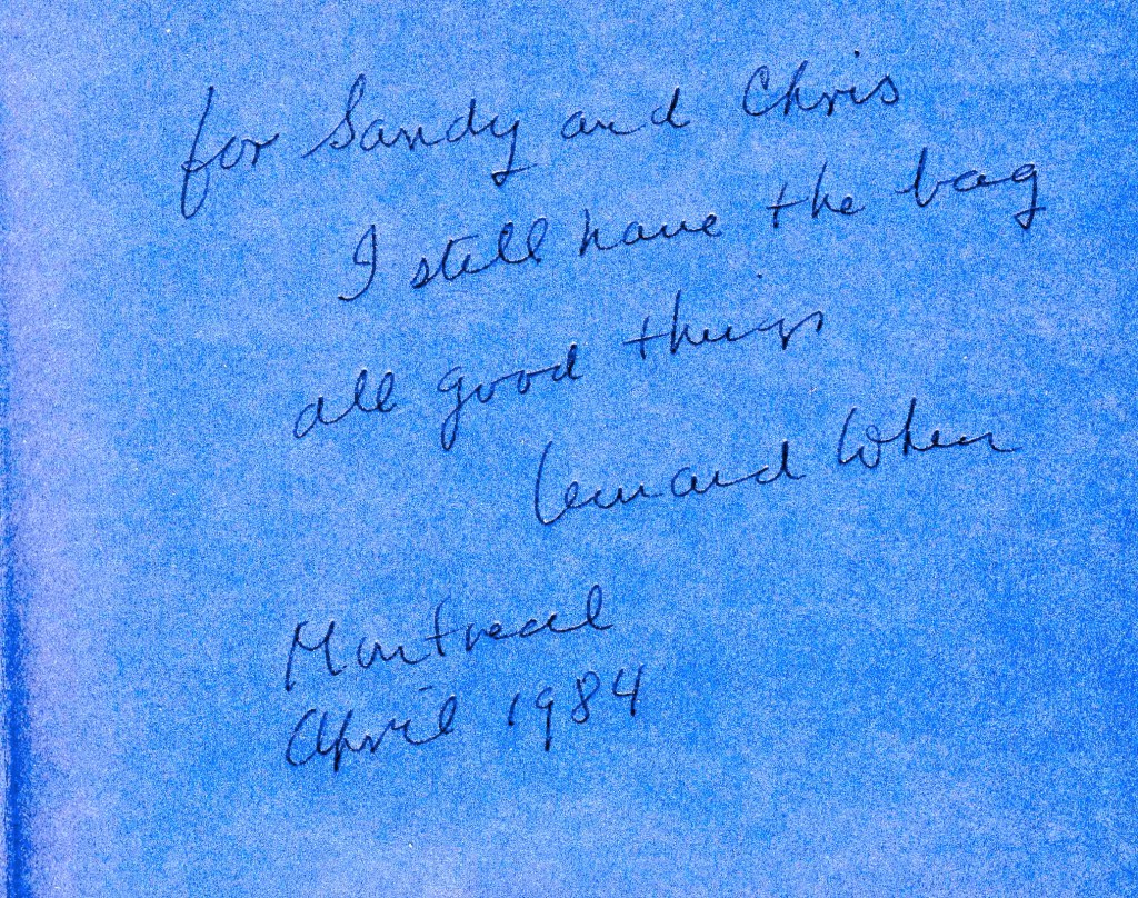 Cancelled? Why? you ask. Why? Because Leonard Cohen was cavorting at his Greek Island retreat–on Hydra–and couldn’t fly back to the States to fulfill his concert commitment because he was having TOO GOOD A TIME HANGING OUT WITH CHRIS AND SANDY BOOTHE. I am still trying to forgive you two.