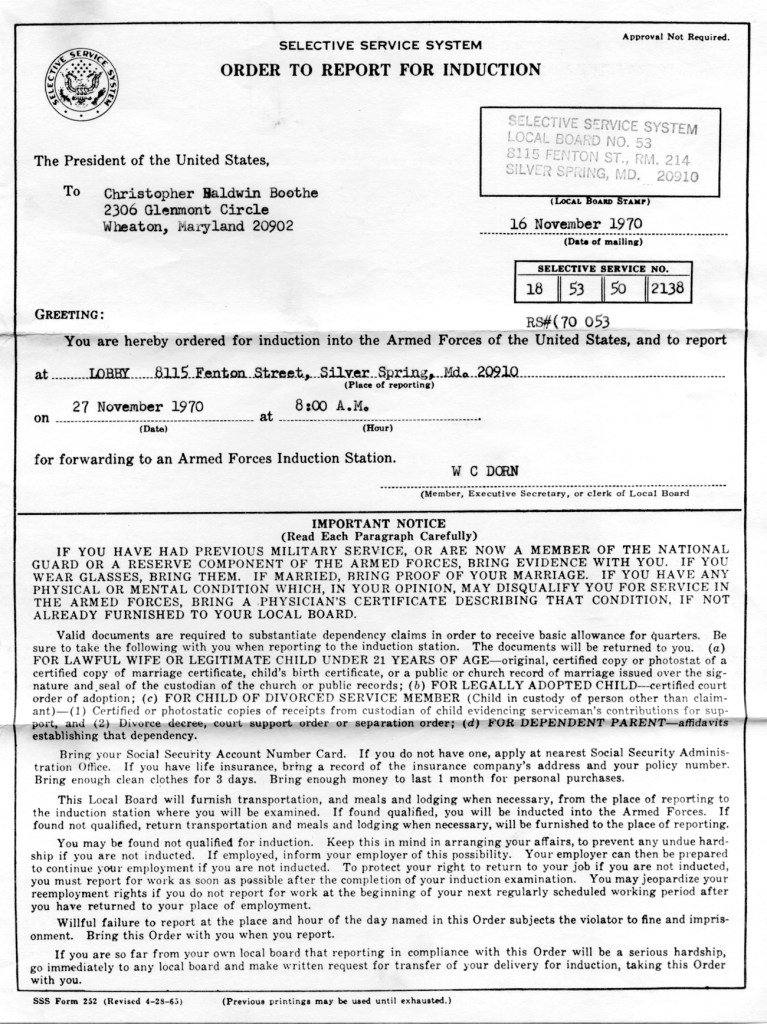 So I went before the draft board for my hearing on my requested conscientious objector status. The secretary was obviously hostile to me during the questioning process; a draft board member had to admonish her to stay businesslike. I came out to my car, and as a draft lawyer had advised, immediately wrote down everything that had transpired at the hearing, and sent my report to the board, to be included in my file.