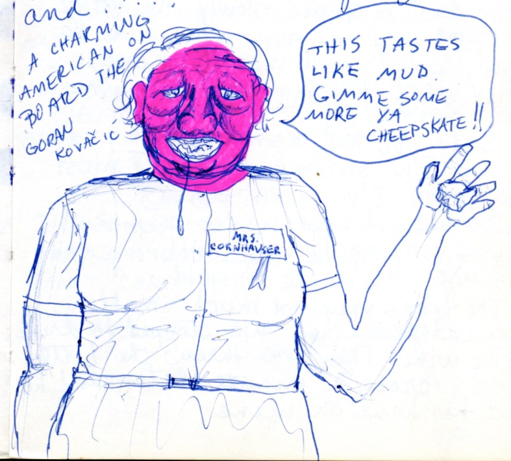 Sandy –We donʼt remember a lot about the other passengers except for a constantly complaining loudmouth who we called Mrs. Cornhauser; her face is pink because she got seriously sunburned.