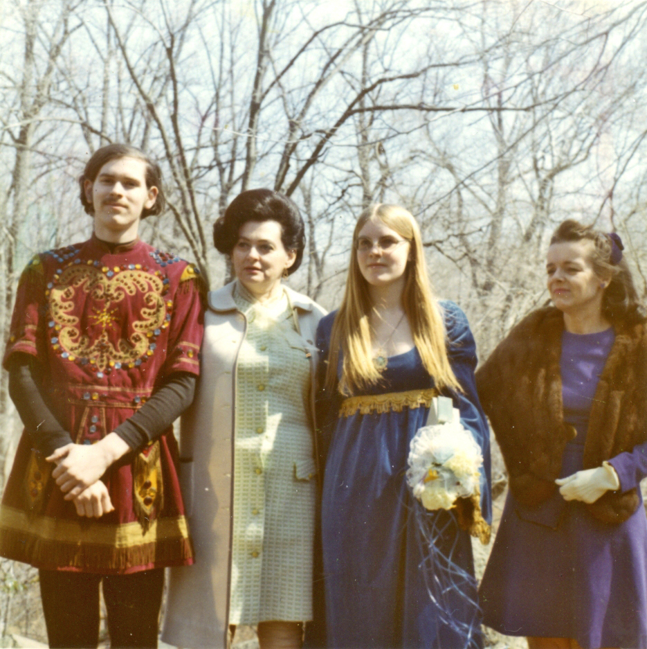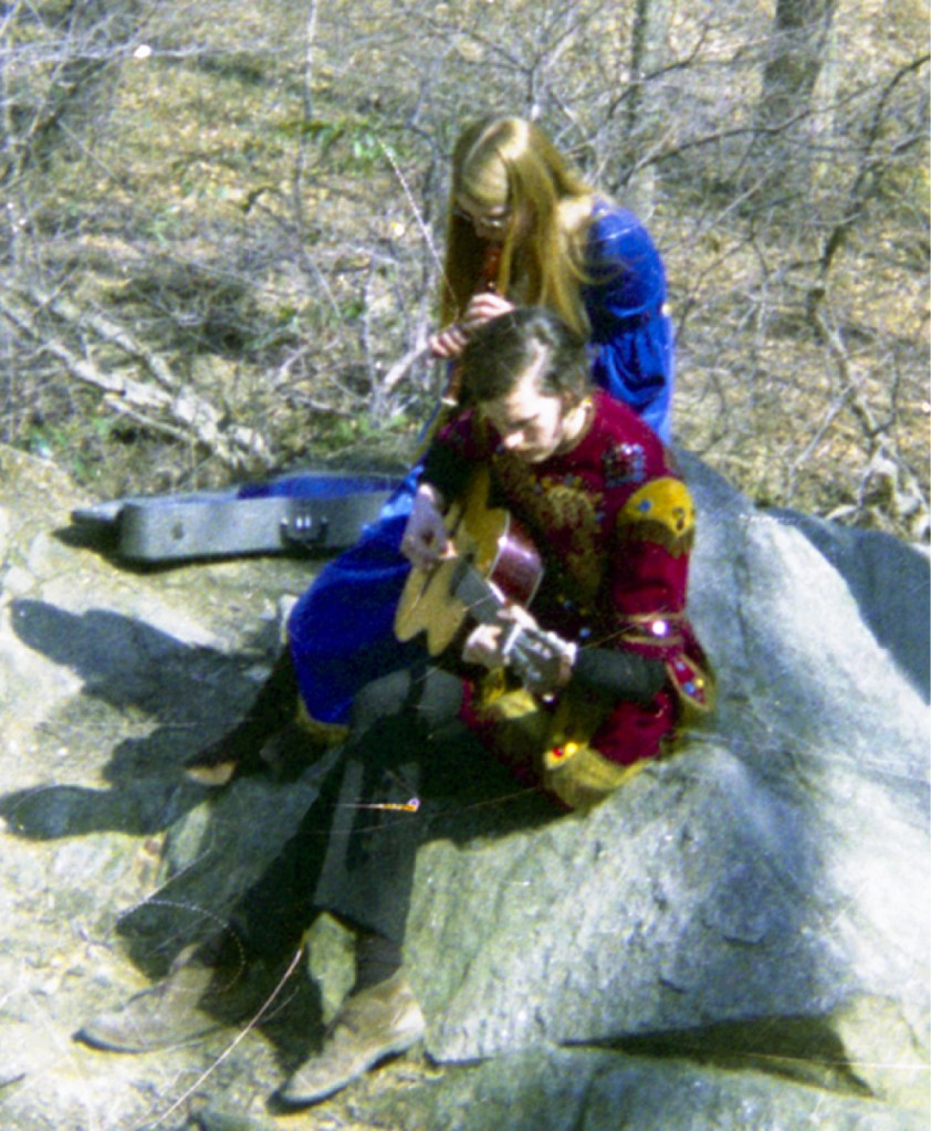 Sandy–We found a used band jacket for Chris in Georgetown–this was the Sergeant Pepper era after all! And a friend gave me 6 yards of velveteen which I used to make my dress, kind of like Scarlett OʼHara and the draperies she used.