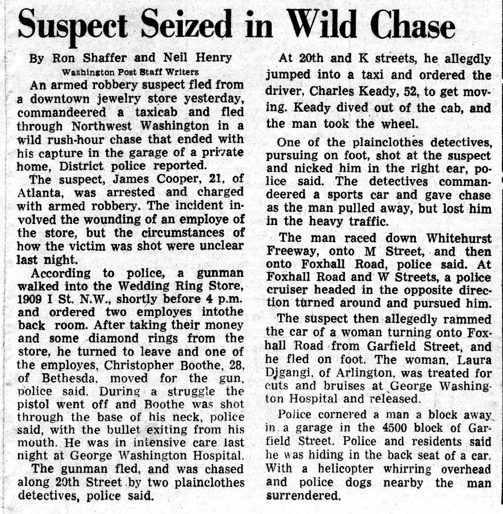 That night we got a call from Barry, Chris’s partner at the jewelry store, that Chris was in the hospital after being shot during an armed robbery. The robber had grabbed something Chris had put a lot of work into that week and chris demonstrated that it wouldn’t go without a struggle. The family was stuck not knowing what to do, so I suggested that they all go up to see Granny as planned while I drove Sandy to D.C. Since we knew little about Chris’ condition the trip was very upsetting to Sandy and I remember trying to talk about different things to distract her (probably not the right thing to do). Barry was there when we arrived and gave us the details of the event so I would have something to tell the others when I got home. Chris was hurt pretty bad, but we knew he would fully recover